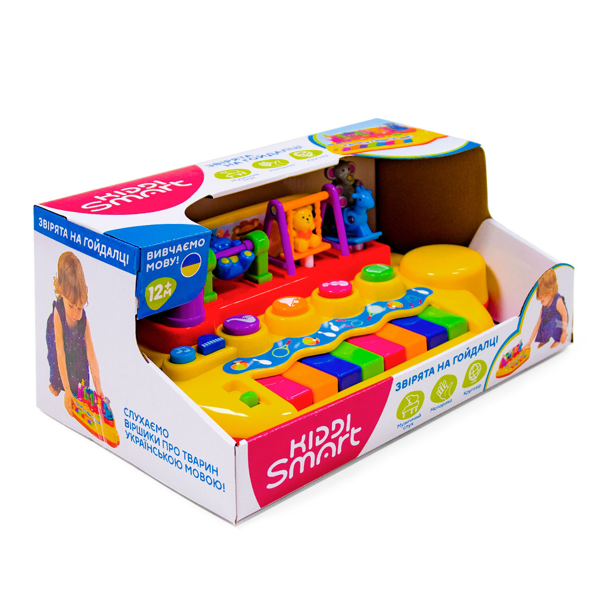 Піаніно Звірята на гойдалці - яскрава та цікава іграшка, яка озвучена українською мовою! З цим чарівним піаніно малюк не тільки зможе насолодитися грою на музичному інструменті під захопливий рух кумедних тваринок, а і послухати пісеньки та віршики українською мовою, дізнатись про корисні навички здорового способу життя і навіть… зробити справжню веселу руханку!