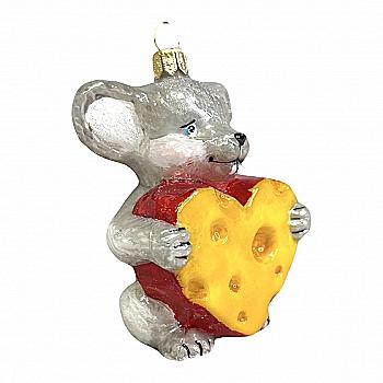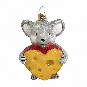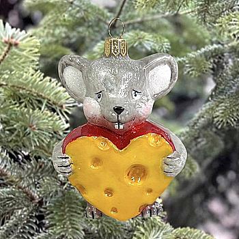 Ялинкова прикраса ручним розписом скляна Миша з сирним серцем 9 см (подар.уп.), A2840