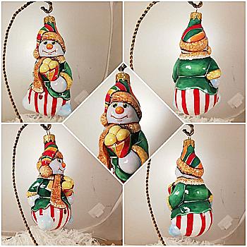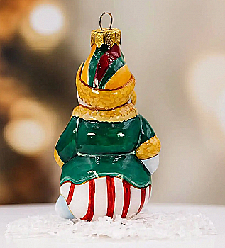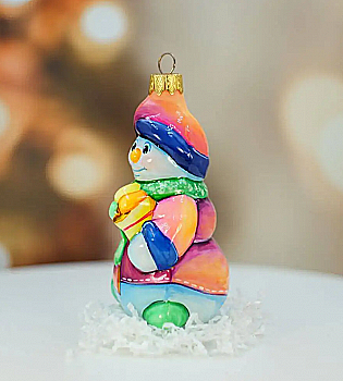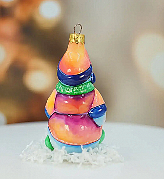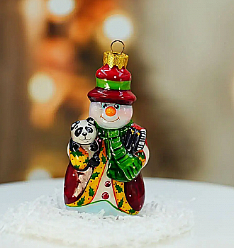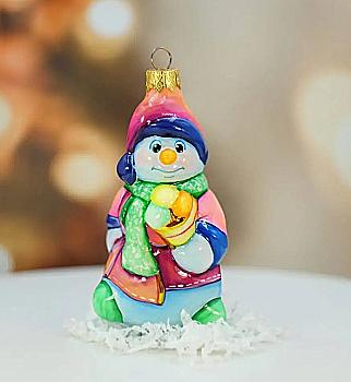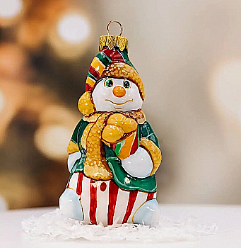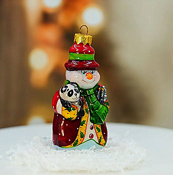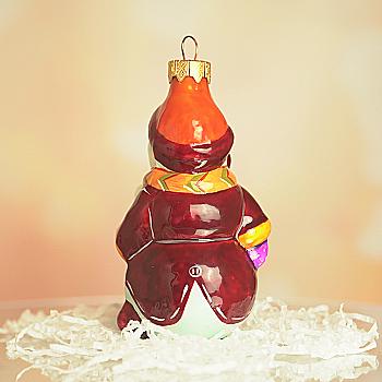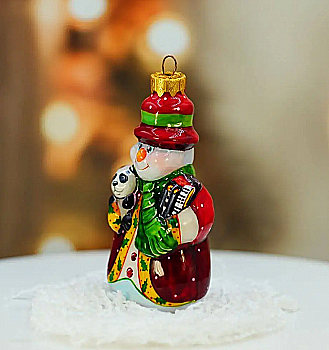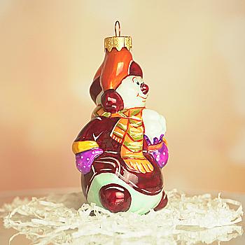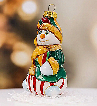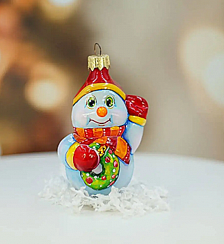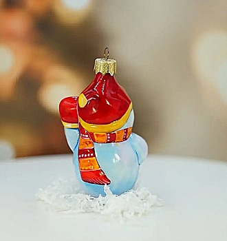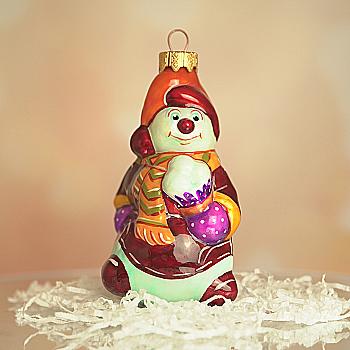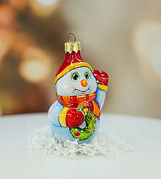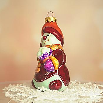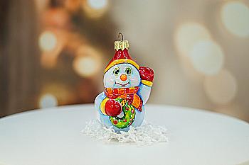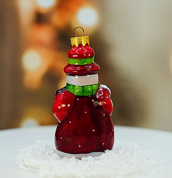 Ялинкова прикраса Куля червона "Joyeux Noel" 6,5 см зі сніговиком зверху, гілочками і бантом, 5573