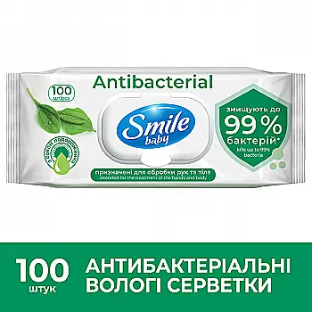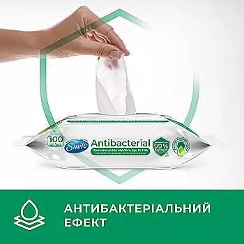 Салфетка влажная SMILE Antibacterial с подорожником, 100 шт., с клапаном new desing, 42112825